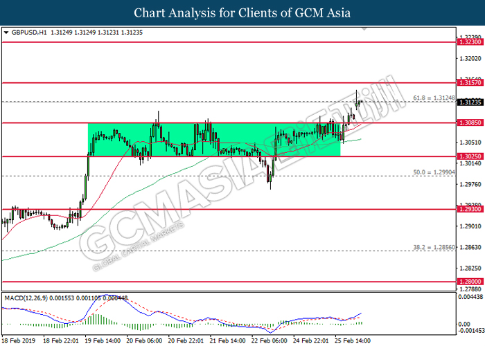 GBPUSD, H1: GBPUSD was traded higher while currently testing at the resistance of 1.3125. MACD which illustrate bullish signal suggests the pair to extend its gains after successfully closing above the target of 1.3125.
