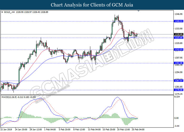 GOLD_, H4: Gold price was traded lower while currently testing near the support level 1325.65. MACD which illustrate bearish bias signal suggest gold to extend its losses after successfully breaking below the support level.