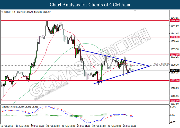 GOLD_, H1: Gold price remains traded within a narrowing triangle following prior retrace from the top. Due to the lack of signal from MACD and price action, it is suggested to wait for a breakout before entering the market.