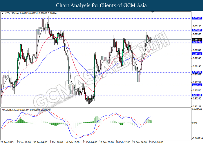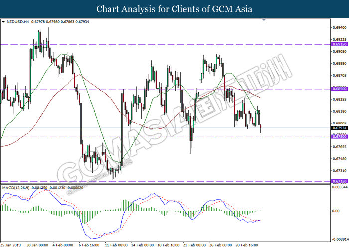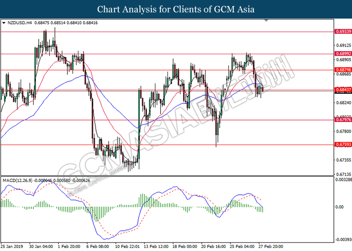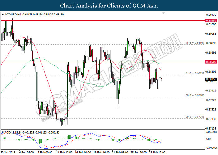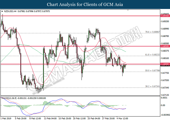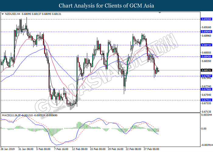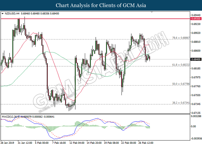 NZDUSD, H4: NZDUSD was traded lower following prior retrace from the resistance at 0.6890. MACD which illustrate diminished upward momentum suggests the pair to be traded lower in short-term as technical correction.