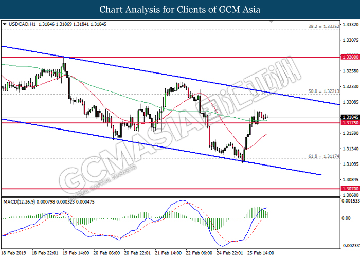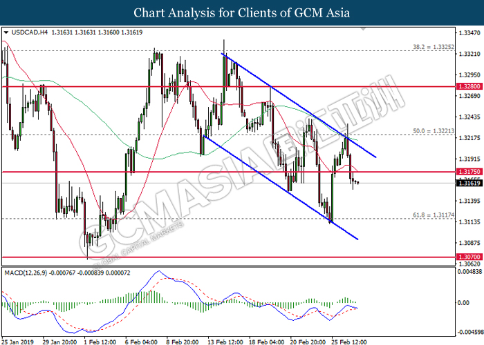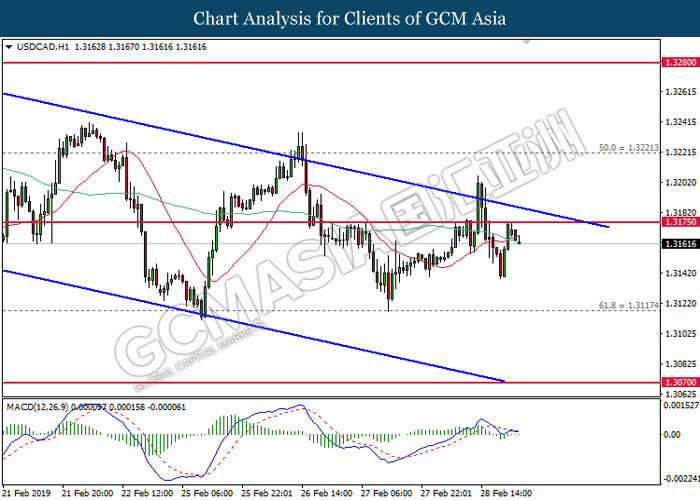 USDCAD, H1: USDCAD was traded flat and currently testing near the support of 1.3175. However, MACD which illustrate diminished upward momentum suggests the pair to be traded lower in short-term following a close below 1.3175.