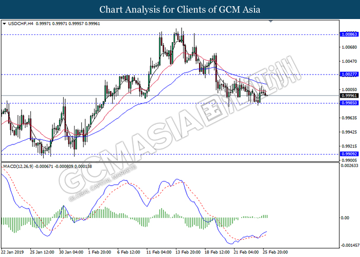 USDCHF, H4: USDCHF remains traded flat in a sideway channel. However, MACD which illustrate bearish bias signal suggest the pair to be traded lower towards the support level 0.9885.