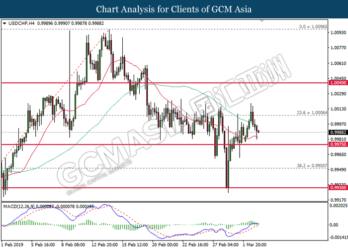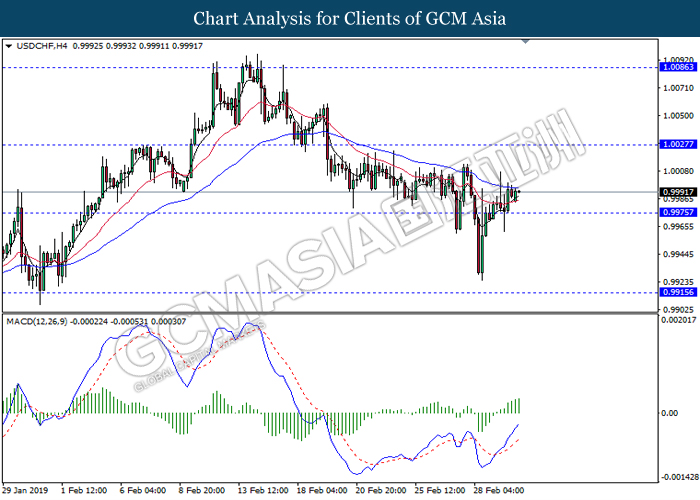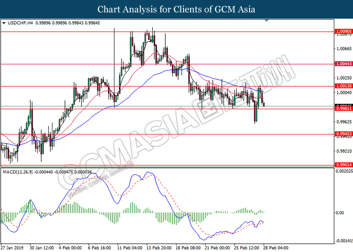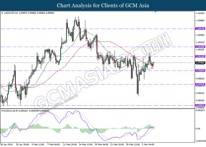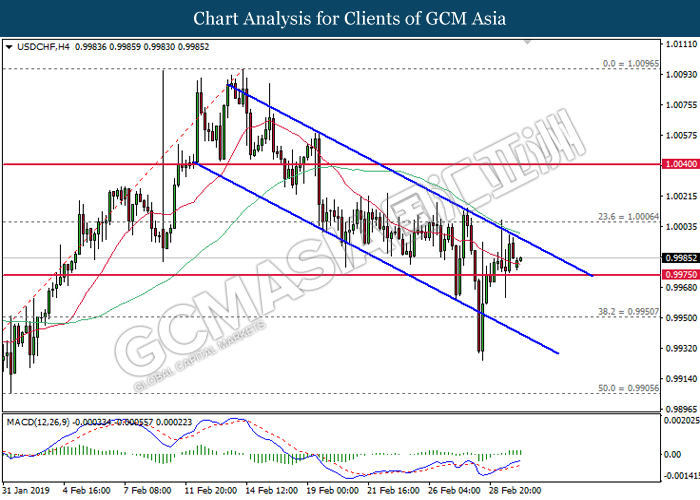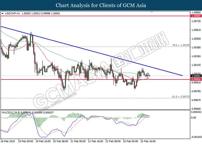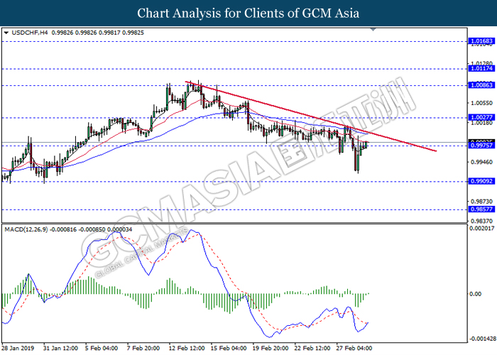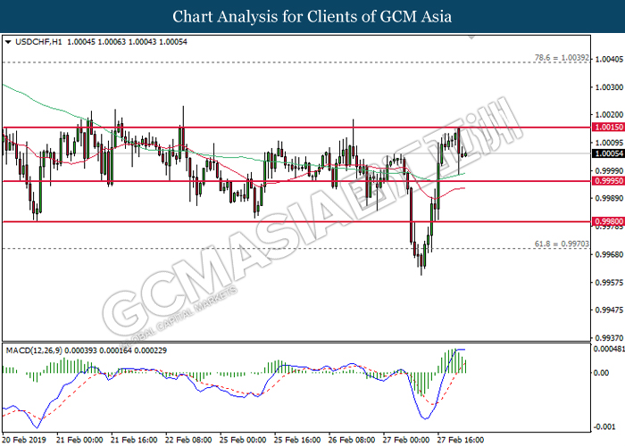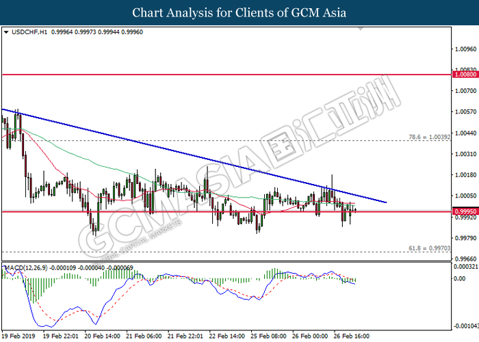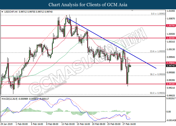 USDCHF, H1: USDCHF was traded lower following prior retracement from the downward trendline. MACD which illustrate diminished upward momentum suggests the pair to extend its losses after closing below the target of 0.9995.