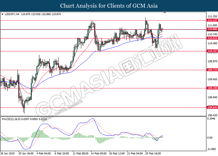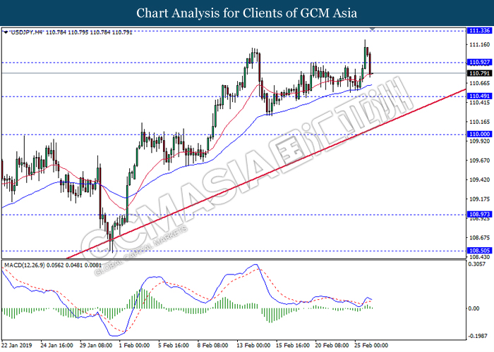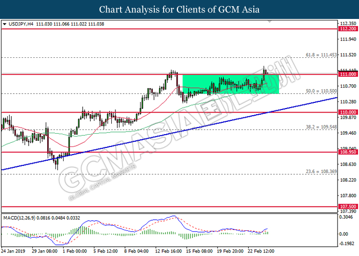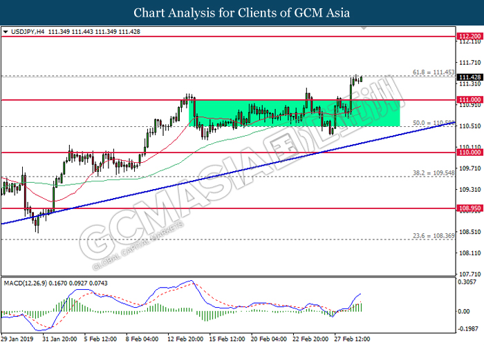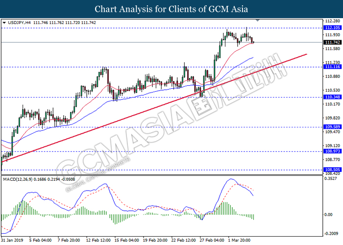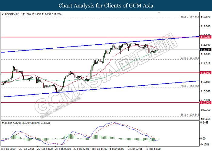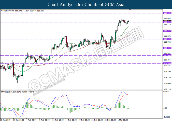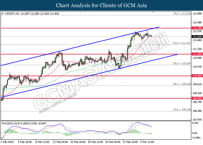 USDJPY, H4: USDJPY was traded higher following prior close above 111.00. However, MACD which illustrate diminished upward momentum suggests the pair to be traded lower in short-term as technical correction.