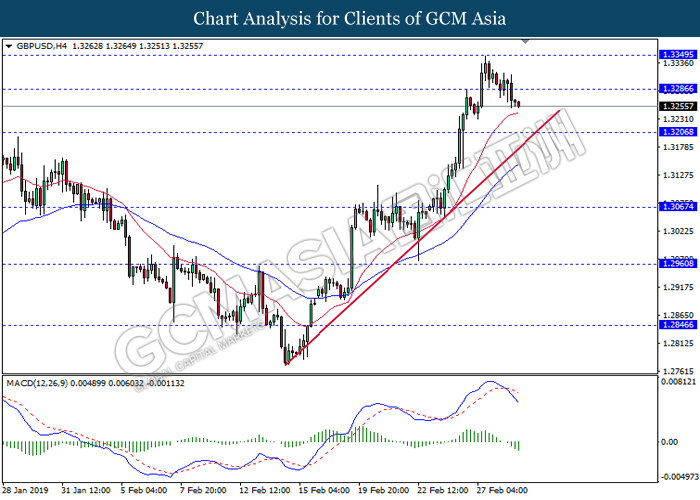 GBPUSD, H4: GBPUSD was traded lower while currently testing at the support of 1.3255. MACD which illustrate diminishing upward momentum suggests the pair to extend its losses in short-term after closing below 1.3255.