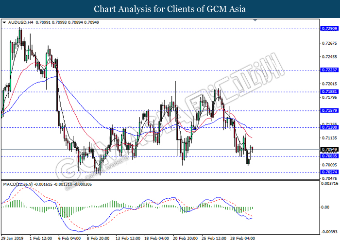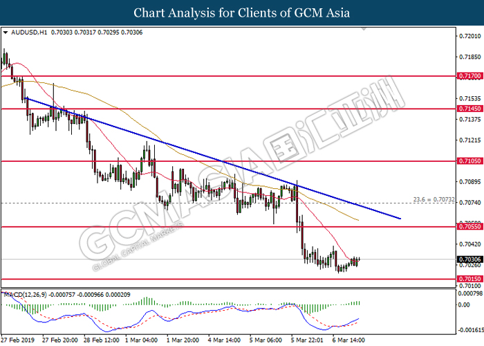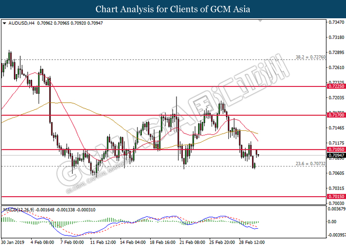 Dollar index measuring against a basket of six major currency pairs further its bullish momentum while holding its ground as market’s safe-haven asset amid global growth concerns. According to Chinese Premier Li Keqiang, China has reduced its growth target to 6% and 6.5% as compared to last year forecasted of 6.6% growth for 2019. The news worsened market sentiment as fear of global growth slowdown spiraled, causing investors to flee into safe-haven dollar. Moreover, US strong housing and services activity further boosted the dollar while investors are still waiting for the outcome of the US-Sino trade deal. On the other hand, the Aussie dollar was suffering losses to a 2-month low following prior release of Australia’s GDP which marked a slowdown in growth by 0.2% compared to economists’ forecast of 0.5% for its fourth quarter. Overall, the pair was recording losses for the past week amid concerns over trade war uncertainties. Dollar index was up by 0.06% to 96.80 while pair of AUD/USD was down by 0.63% to 0.7035 as of writing.