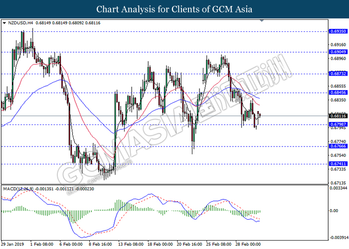 NZDUSD, H4: NZDUSD was traded lower while currently testing near the support level 0.6875. MACD which illustrate bearish bias signal suggest the pair to extend its bearish momentum after it breaks below the support level 0.6875.