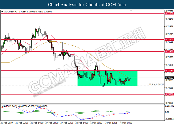 AUDUSD, H1: AUDUSD was traded higher following prior rebound from the lower level. MACD which illustrate bullish signal suggests the pair to be traded higher in short-term as technical correction.