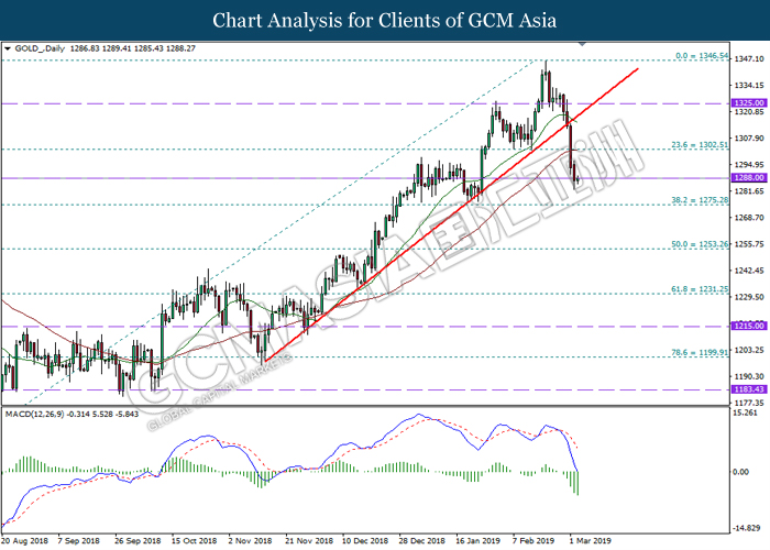 In the commodities section, crude oil price ticked down by 0.02% to $56.20 per barrel. Oil prices was traded mixed since Monday while investors wait for further market signals with regards to US-China trade talks and US crude inventories level. On the other hand, gold price slumped 0.03% to $1,287.62 a troy ounce due to diminishing market risks and appreciating greenback.