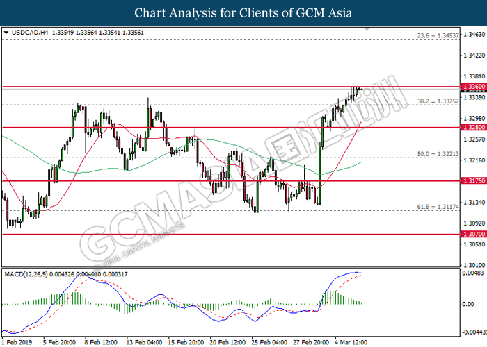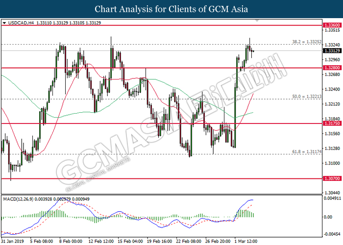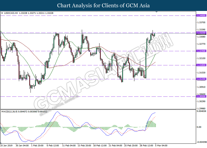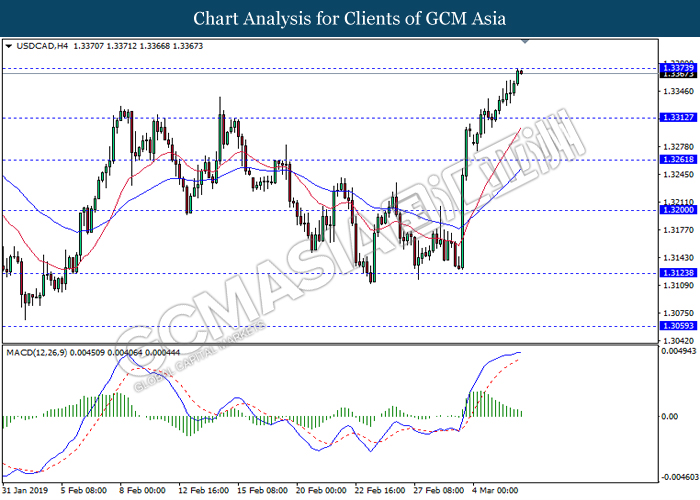 USDCAD, H4: USDCAD was traded higher while currently testing the resistance level 1.3375. However, MACD which display diminishing bullish momentum suggest the pair to undergo short-term technical correction towards the support level 1.3310.