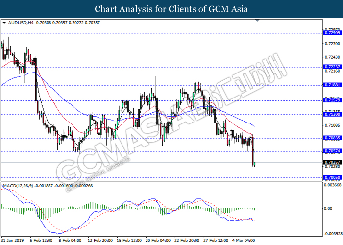 AUDUSD, H4: AUDUSD was traded lower following prior breakout below the previous support level 0.7055. MACD which display bearish bias signal suggest the pair to extend its losses towards the support level 0.7005.