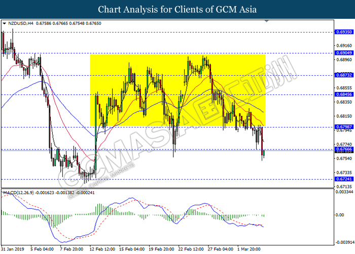 NZDUSD, H4: NZDUSD was traded lower while currently testing near the support level 0.6760. MACD which illustrate bearish bias signal suggest the pair to extend its losses after successfully breaking below the support level.