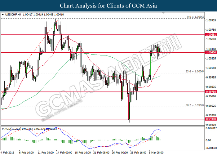 USDCHF, H4: USDCHF was traded lower while currently testing at the strong support at 1.0040. MACD which illustrate diminishing bullish momentum suggests the pair to extend its losses after closing below the level of 1.0040.