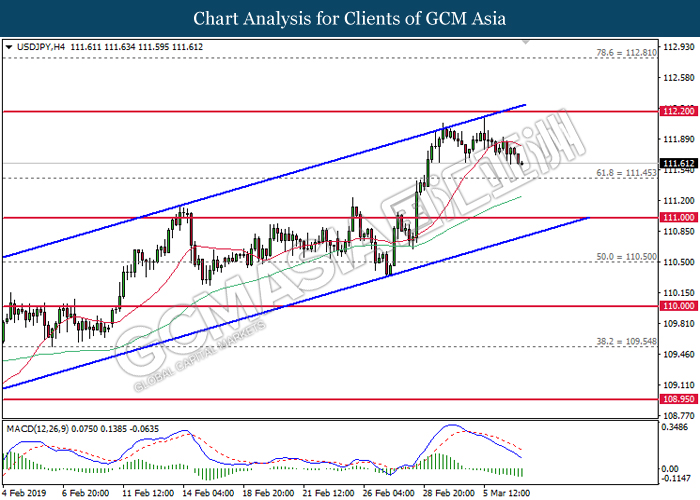 USDJPY, H4: USDJPY was traded lower following prior retracement from the top level of ascending channel. MACD which illustrate bearish signal suggests the pair to advance further down in short-term, towards the direction of 111.45.