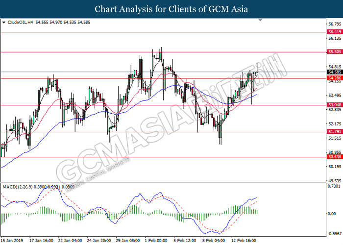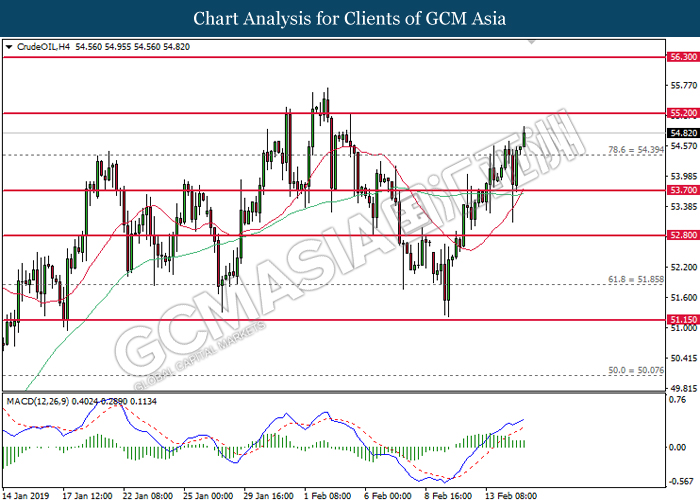 CrudeOIL, H4: Crude oil price was traded higher following prior close above the resistance at 54.40. MACD which illustrate bullish signal suggests its prices to extend its gains after breaking the strong resistance at 55.20.