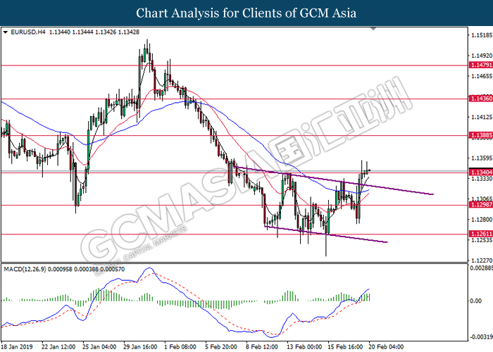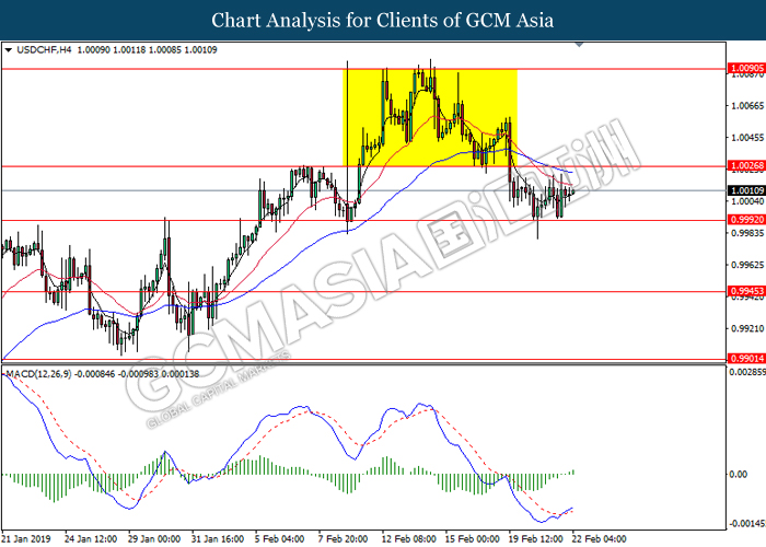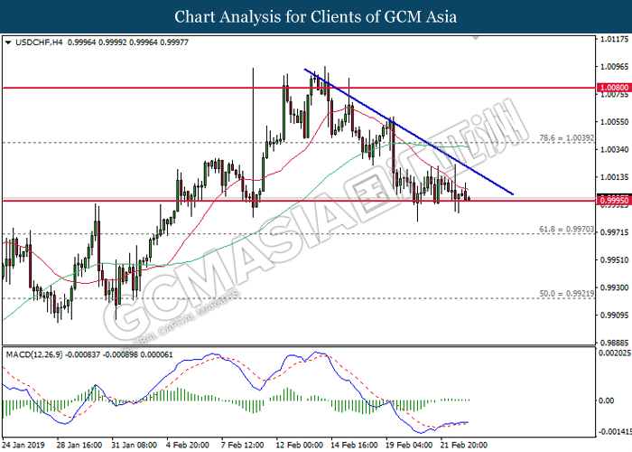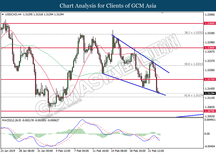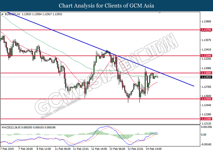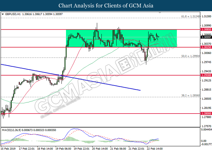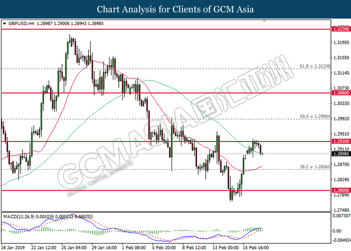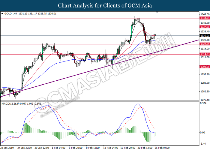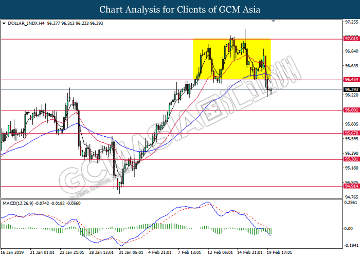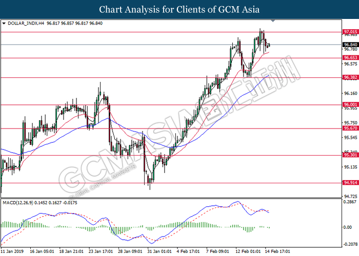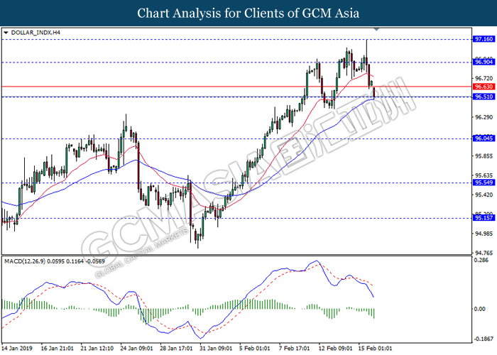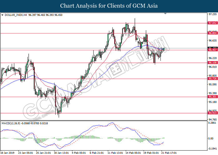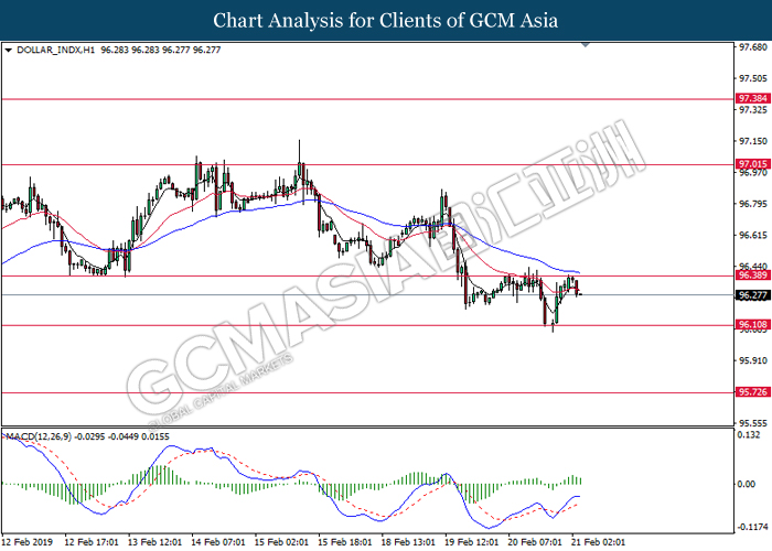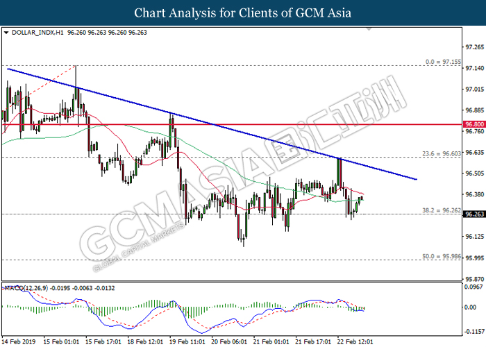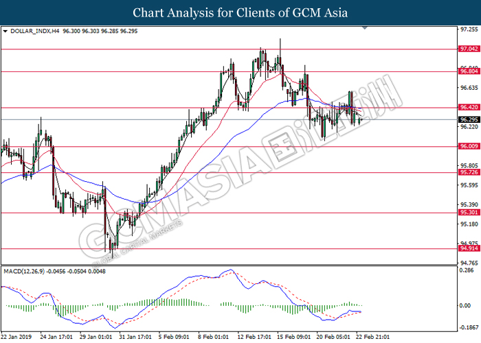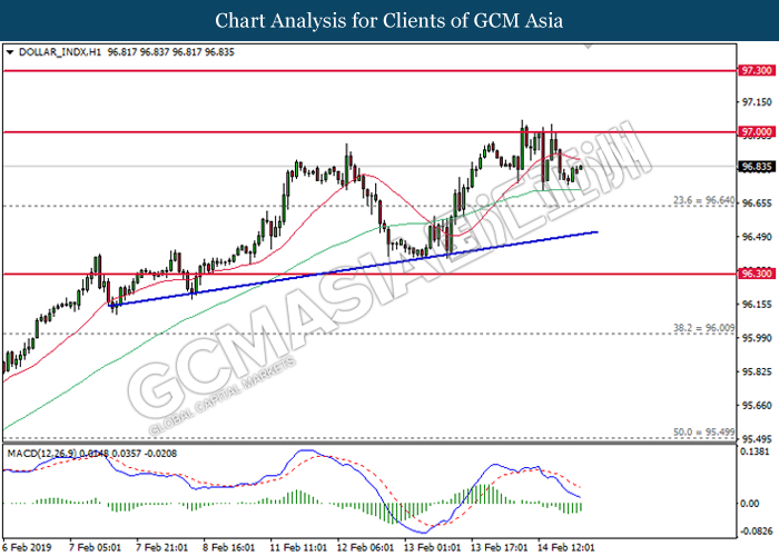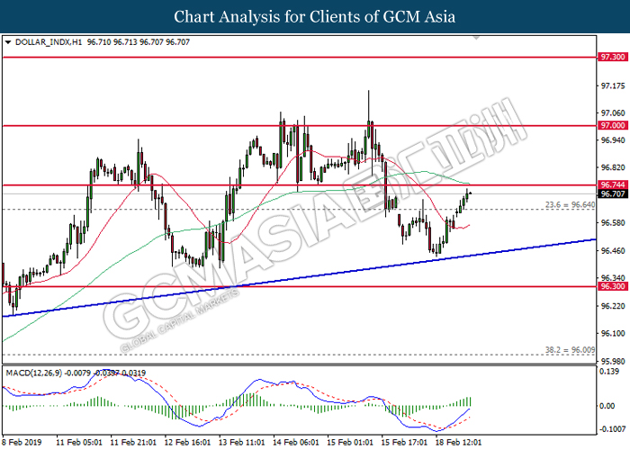 Dollar index which gauge its value against a basket of six major currencies edged up during Asian trading session while market sentiment are still undecided ahead of the outcome of trade talk. Two negotiators from White House administration will have a meeting with Chinese Premier Xi Jinping later today, yet there is no deal on March 1 deadline extension been made between both countries as of now, said by White House economic adviser Larry Kudlow. At the meantime, the news of US tariff on $200 billion China imported goods will be increased to 25% from 10% if both parties does not reach a deal at the end of the trade talk has further generated bullish momentum toward the Greenback, where US people will prone to buy local goods rather than imported goods. Prior to the European trading session, Dollar index quoted up 0.09% to 96.85. On the other hand, the pair of GBP/USD dipped 0.14% to 1.2785 after UK Prime Minister Theresa May suffers another defeat on her Brexit negotiating strategy yesterday. At the moment, adversary leader Jeremy Corbyn urged Theresa May to come out with a new plan parliament support, which rule out the possibility of no deal Brexit.
