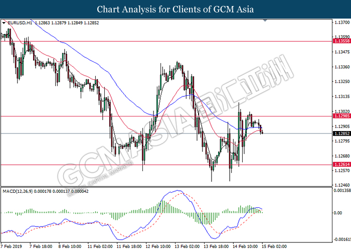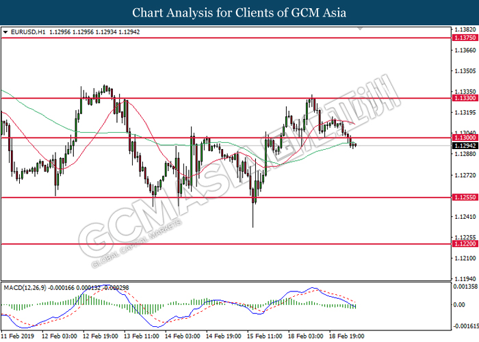 EURUSD, H1: EURUSD was traded lower following prior retracement from the resistance of 1.1300. MACD which illustrate diminished upward momentum suggests the pair to be traded lower toward the support level at 1.1260.
