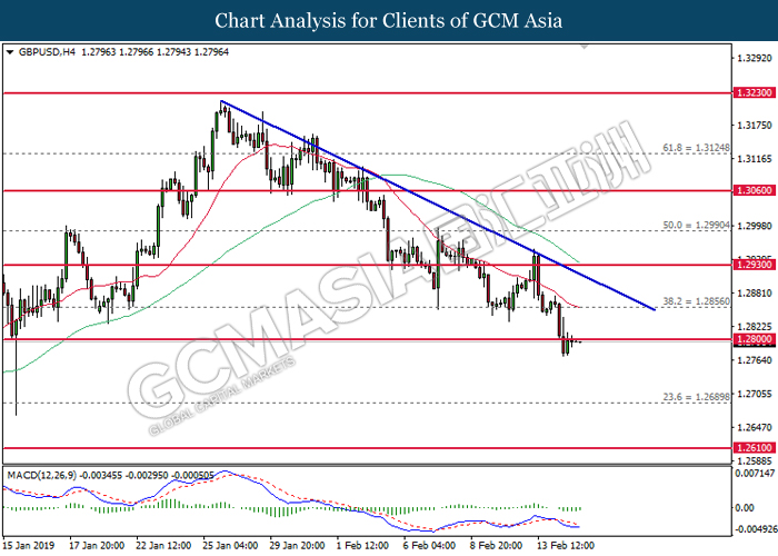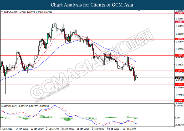 GBPUSD, H4: GBPUSD was traded lower following prior closure below 1.2800. MACD which illustrate bearish signal suggests the pair to extend its losses in mid-term, towards the direction of 1.2700.