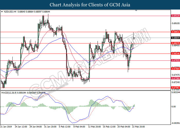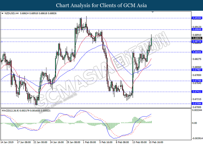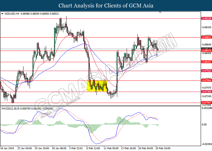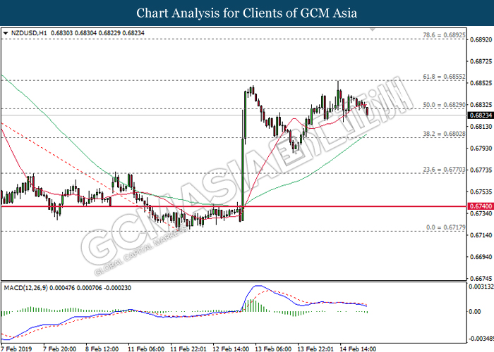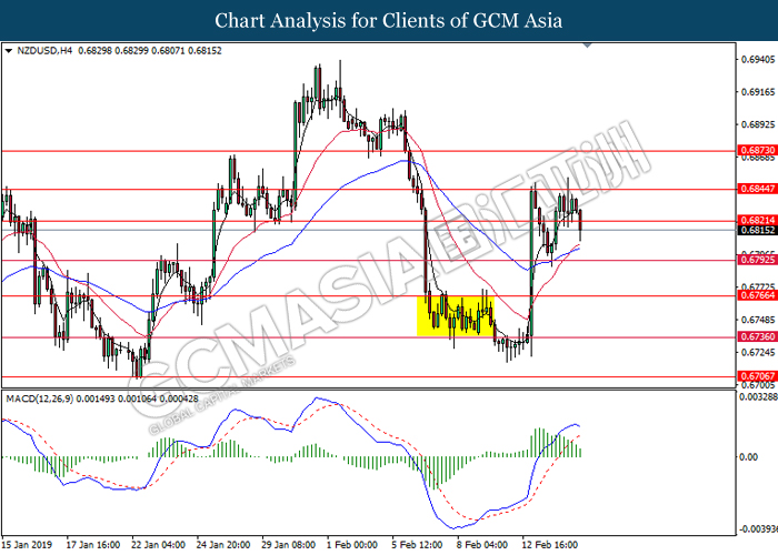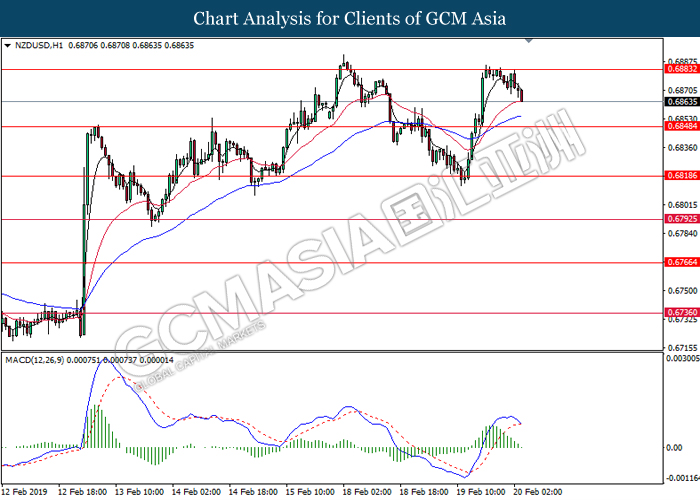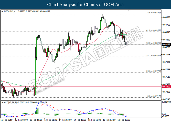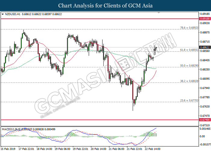 Dollar index which gauge its value against a basket of six currencies tumbled after Donald Trump announced to delay the March 1 tariff deadline following substantial progress talk between two countries during last weekend. After a long week of trade focused meeting, US president Donald Trump tweeted that US had undergo a well talk with China on important structural issues including intellectual property protection, technology transfer, agriculture, services, currency, and many other issues. At the moment, Donald Trump is planning a Summit to meet China Premier Xi Jinping to conclude an agreement. Closer to a trade deal between both parties dampening investors fear over the outlook of global economic growth. Dollar index inched down 0.07% to 96.30 during early Asian trading session. On the other hand, the pair of NZD/USD edged up 0.42% to 0.6875 amid upbeat Core Retail Sales data been announced before Asian trading session. According to Statistics New Zealand, the data came in at 1.7% compared to economist forecast of 0.5% where pharmaceuticals, duty free goods and food services taken the biggest pie on boosting overall spending in December 2018.
