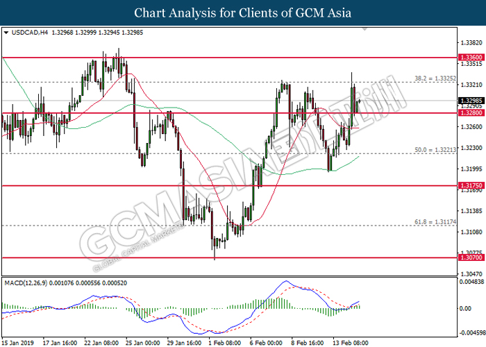 USDCAD, H4: USDCAD was traded higher following prior rebound from the support at 1.3285. MACD which illustrate bullish signal suggests the pair to extend its gains toward the resistance level at 1.3360.