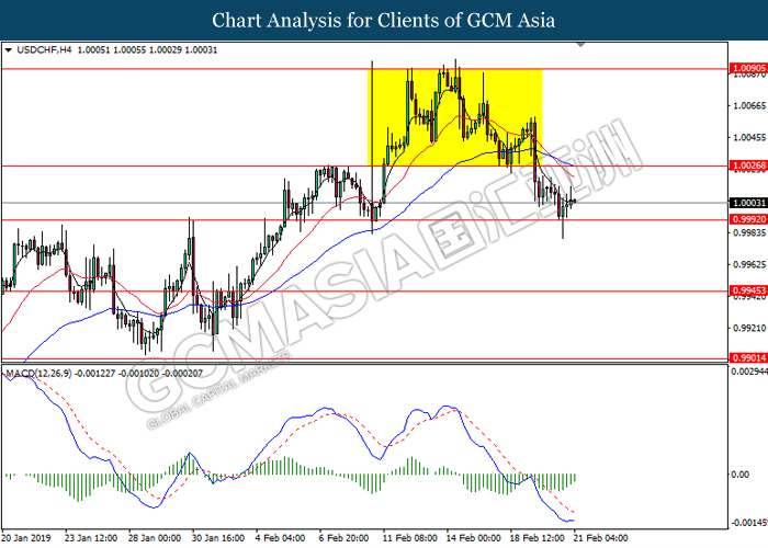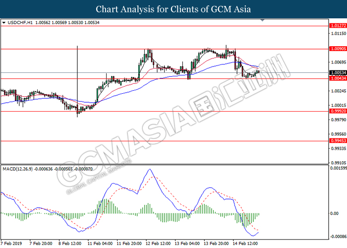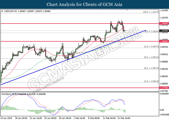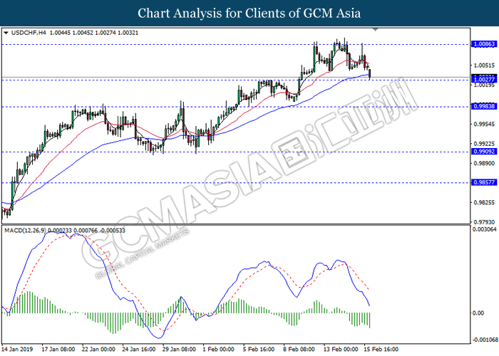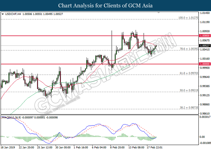 USDCHF, H4: USDCHF was traded lower following prior retracement from the resistance at 1.0080. MACD which illustrate bearish signal suggests the pair to extend its losses in short-term as technical correction.