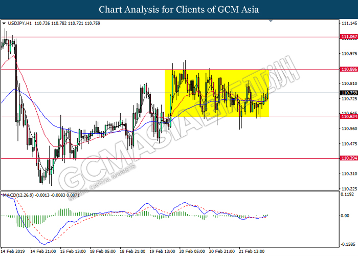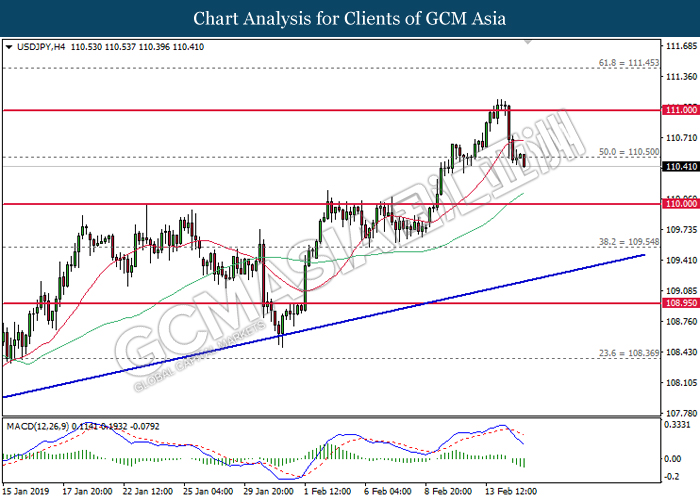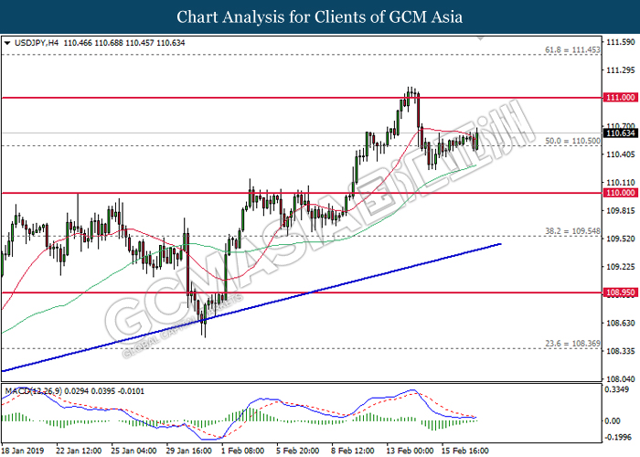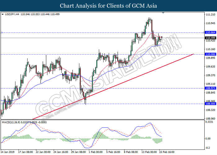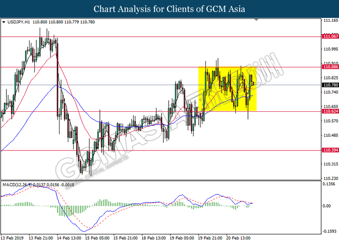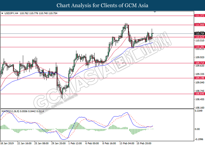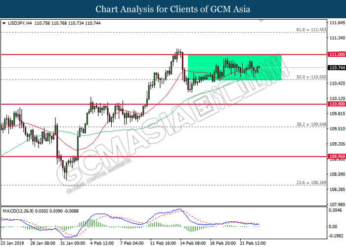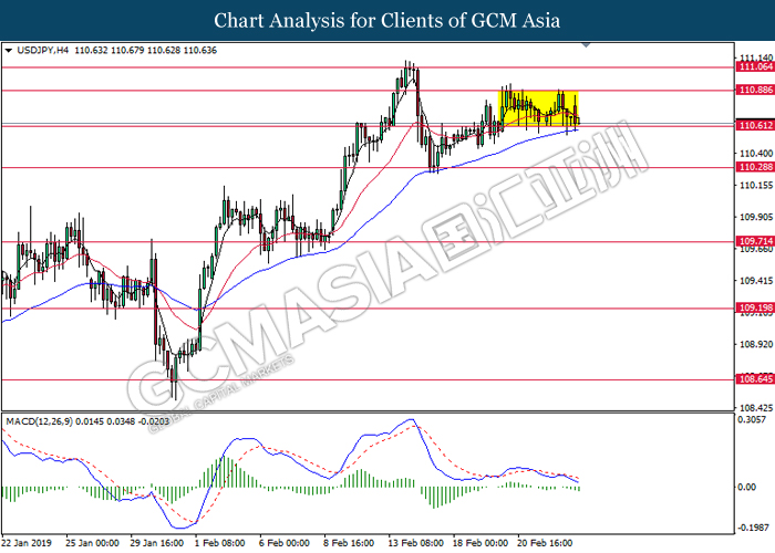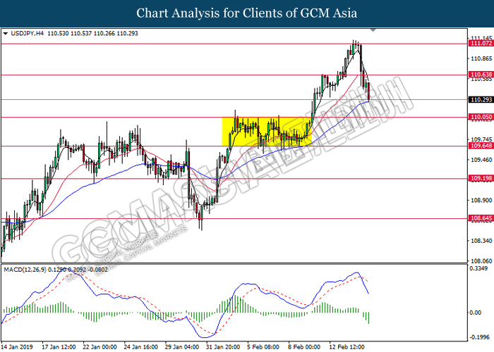 USDJPY, H4: USDJPY was traded flat after it breaks below the previous support level 110.65 recently. However, MACD which illustrate diminishing bearish momentum suggest the pair to be traded higher after it breaks back above the resistance level at 110.65.