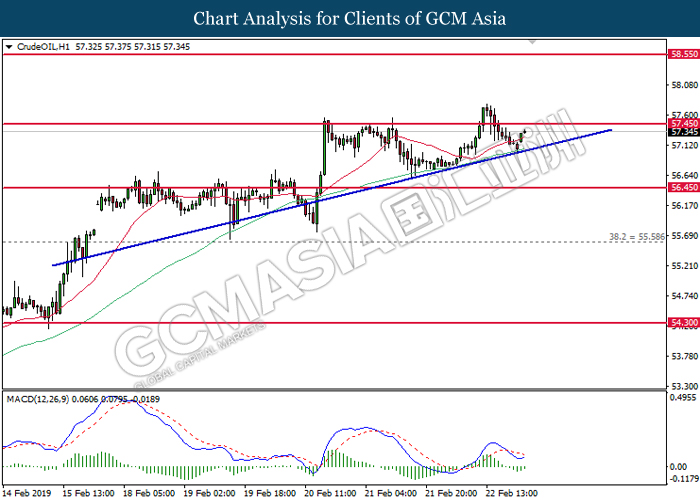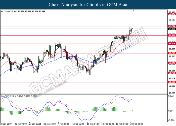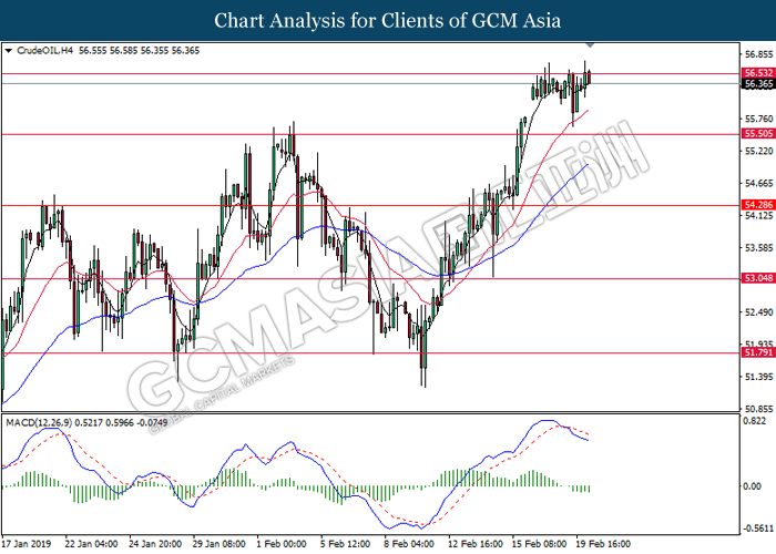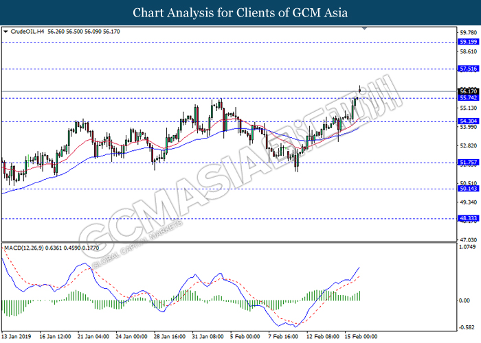 Crude oil price registered gains and pressed higher while closing last Friday market with the price of $57.15 per barrel following investors celebrated trade talk optimism between US – China during last week where US President Donald Trump met with China’s top trade representative, Vice Premiere Liu He. Besides that, ongoing evidence of declines in world-wide oil output such as Baker Hughes weekly rig-count data edge back by 4 to 853, increasing further positive momentum for the commodity.