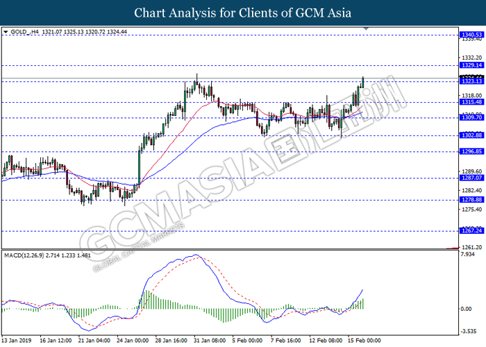 GOLD_, H4: Gold price was traded higher while currently testing near the resistance level 1323.10. MACD which illustrate bullish momentum suggest the commodity to extend its gains after it breaks above the resistance level.