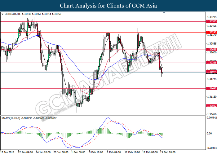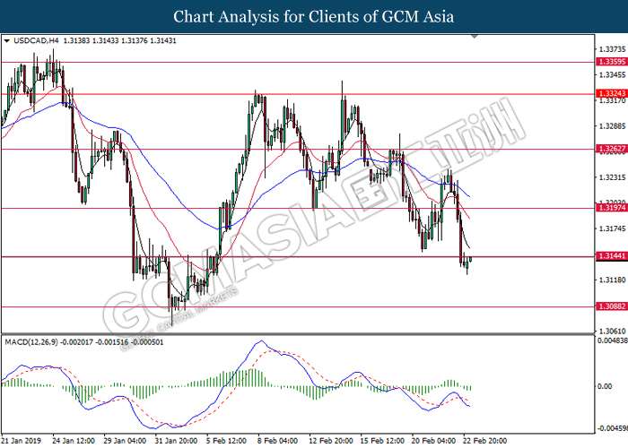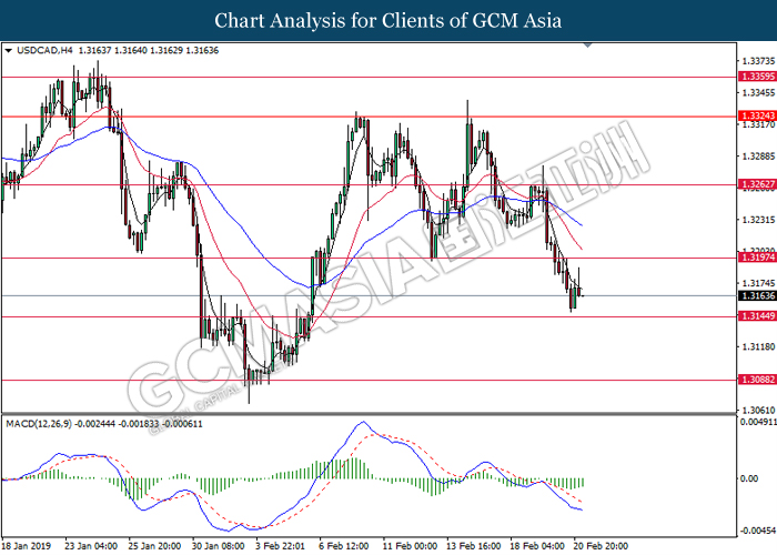 USDCAD, H4: USDCAD was traded higher while currently retesting the resistance level at 1.3145. MACD which illustrate bearish bias momentum suggests the pair to undergo technical correction in short term toward the support level at 1.3090.