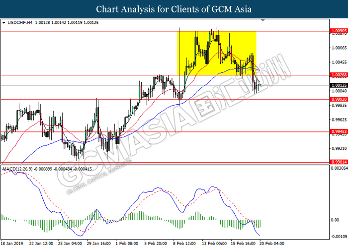 USDCHF, H4: USDCHF was traded lower while currently testing the support level 1.0025. MACD which illustrate persistent bearish momentum suggest the pair to extend its losses after it breaks below the support level at 1.0025.