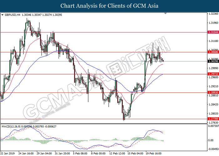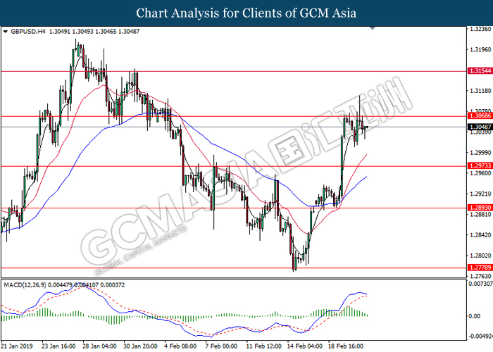 GBPUSD, H4: GBPUSD was traded higher while currently testing the resistance level at 1.3070. MACD which illustrate diminishing bearish momentum suggest the pair to extend its gains after successfully breakout the resistance level at 1.3070.