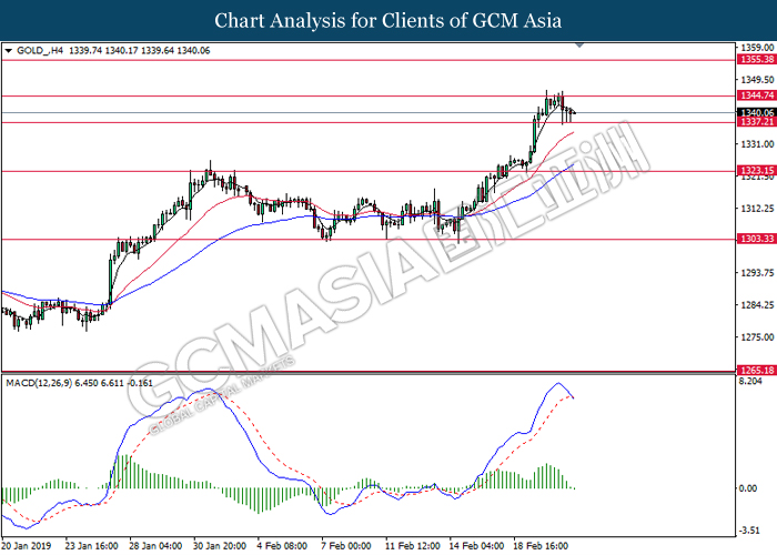 GOLD_, H4: Gold price was traded higher following prior rebound from the support level at 1322.65. MACD which illustrate diminished downward momentum suggests its prices to extend its gains toward the resistance level at 1337.20.