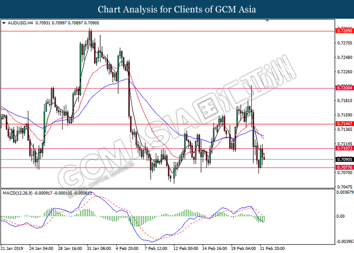 AUDUSD, H4: AUDUSD was traded lower while currently testing at the support of 0.7070. MACD which illustrate diminishing upward momentum suggests the pair to extend its losses after a successful close below 0.7070.