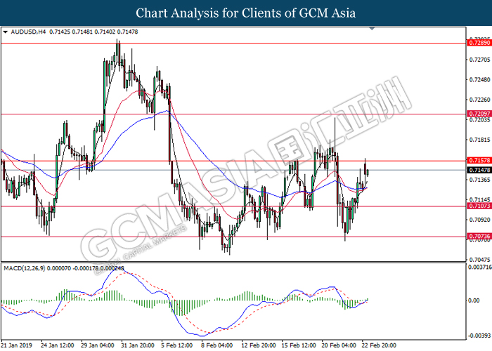 AUDUSD, H4: AUDUSD was traded higher following prior breakout above the previous resistance level at 0.7105. MACD which has begun to form a golden cross signal suggests the pair to extend its gains, towards the direction of 0.7160.