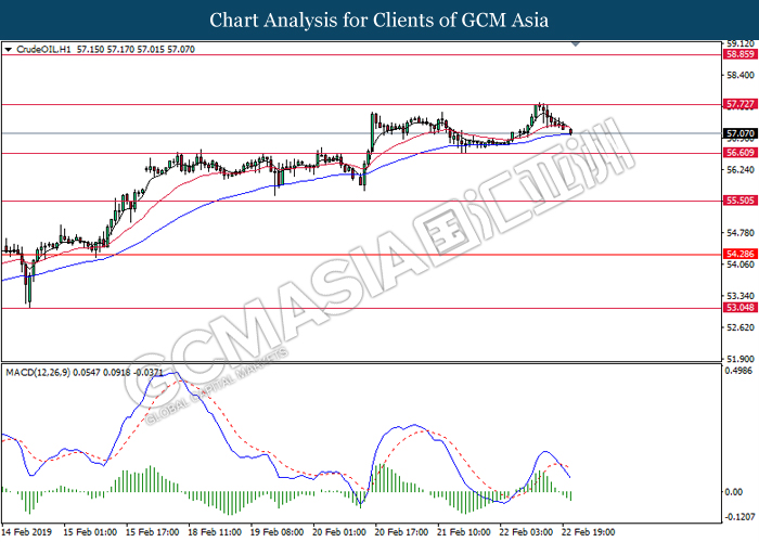 CrudeOIL, H1: Crude oil price was traded lower following prior retracement from the resistance level at 57.75. MACD which illustrate bearish signal suggests its prices to extend its losses toward the support level at 56.60.