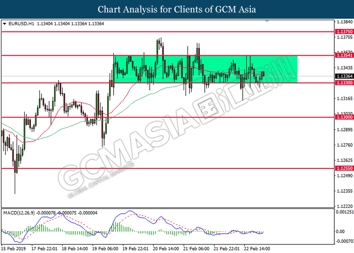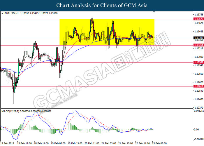 EURUSD, H1: EURUSD remains traded within a sideways channel following prior rebound from the lower level. Due to the lack of signal from MACD and price action, it is suggested to wait for a breakout before entering the market.
