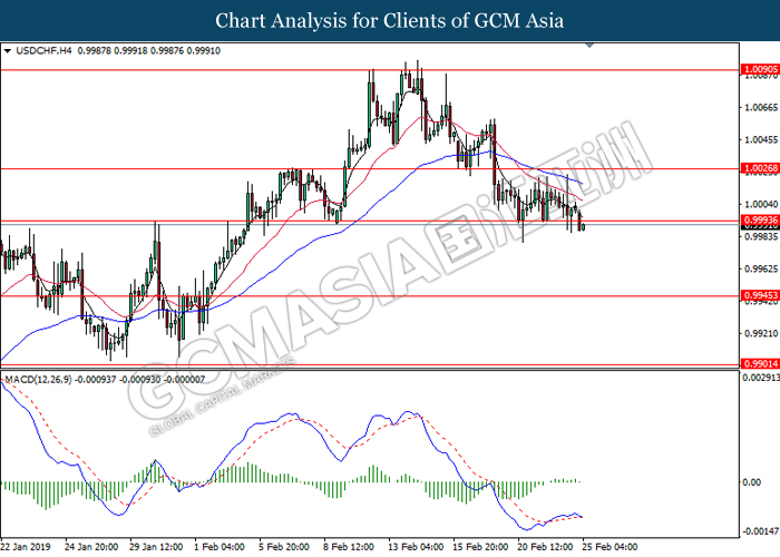 USDCHF, H4: USDCHF was traded lower following prior breakout below the previous support level at 0.9995. MACD which illustrate diminishing bullish momentum and the formation of death cross suggest the pair to extend its losses toward the support level at 0.9945.