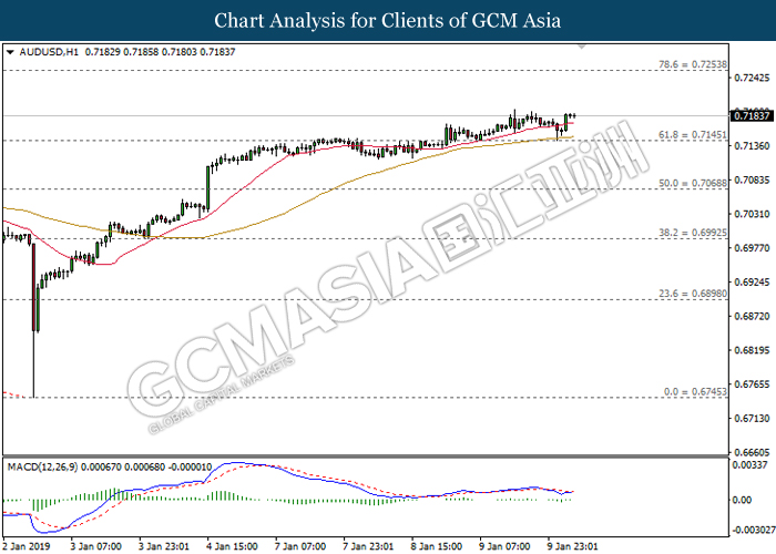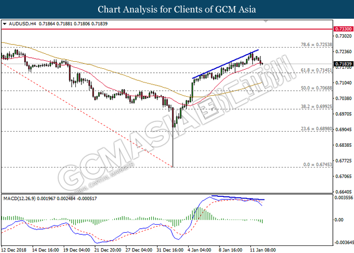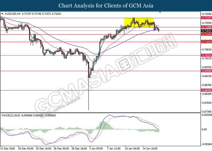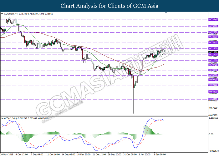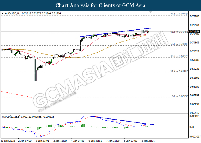 AUDUSD, H1: AUDUSD was traded higher following prior closure above 0.7145. However, MACD which begins to form a bearish divergence signal suggests the pair to be traded lower in short-term after a successful close below 0.7145.