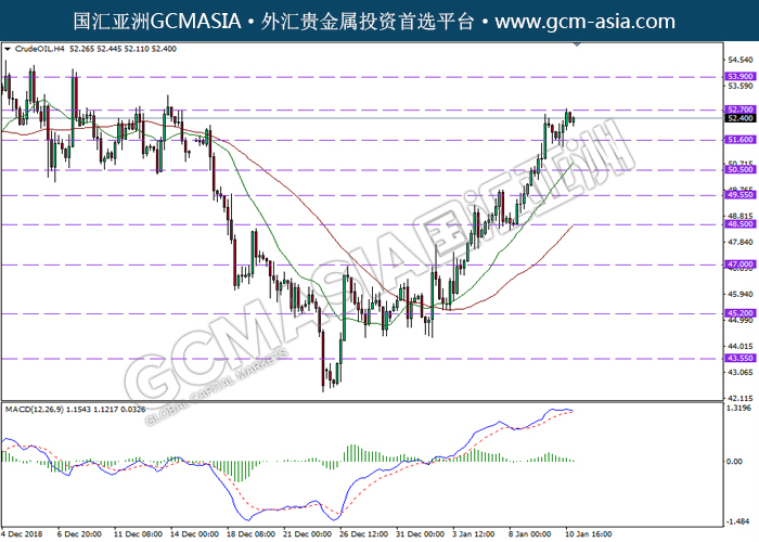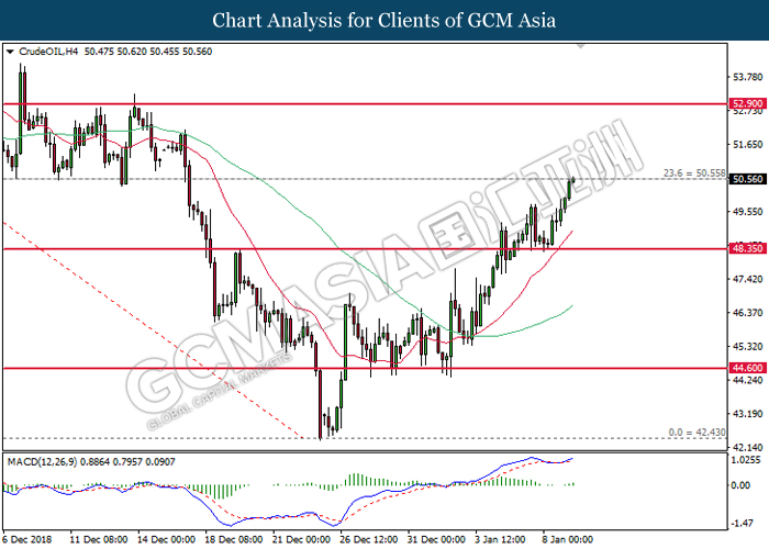 CrudeOIL, H4: Crude oil price was traded higher while currently testing at the resistance level of 50.55. MACD which has formed a golden cross signal suggests the commodity price to advance further upwards after a successful close above 50.55.