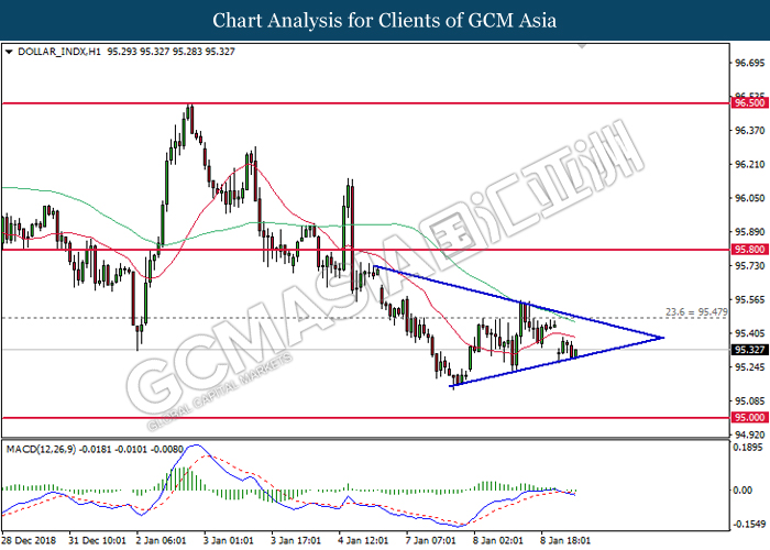 DOLLAR_INDX, H1: Dollar index was traded higher following prior gap down from the top level. However, MACD which illustrate diminishing bullish momentum and the formation of death cross suggest the index to undergo technical correction in short term toward the support level at 95.15.
