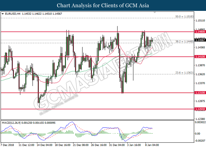 EURUSD, H4: EURUSD was traded flat following prior rebound near the support level at 1.1450. MACD which illustrate diminishing upward momentum suggests the pair to extend its losses after successfully breaking the target at 1.1450.