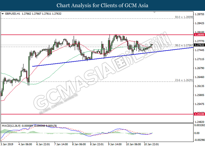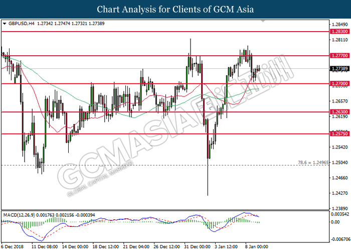 GBPUSD, H1: GBPUSD was traded higher following prior rebound from the support level near the support level at 1.2700. MACD which illustrate starting of bullish momentum and the formation of golden cross suggest the pair to extend its gain toward the resistance level at 1.2785.