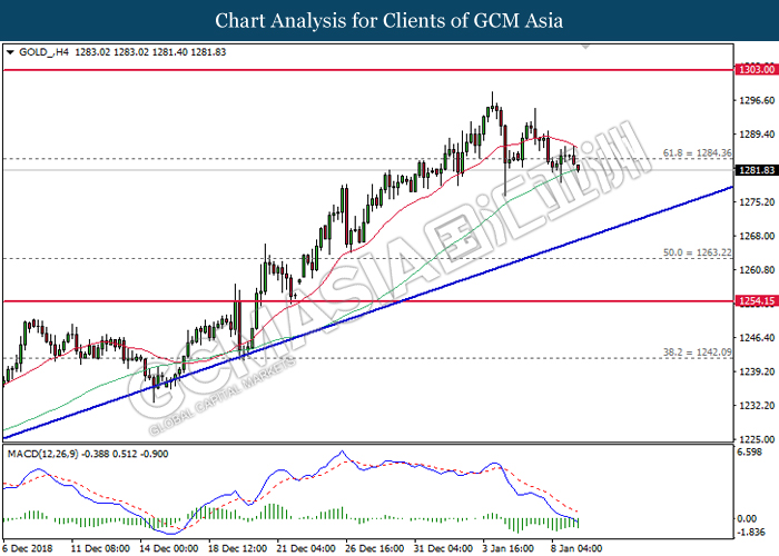 GOLD_H1: Gold was traded higher following prior breakout above the previous resistance level at 1282.65. However, MACD which illustrate diminishing bullish momentum suggest the commodity to undergo technical correction in short term toward the support level at 1282.65.