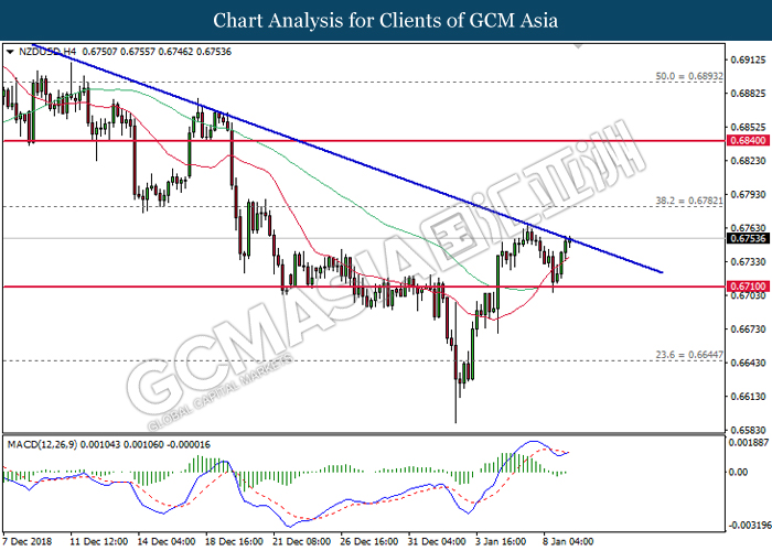 NZDUSD, H4: NZDUSD was traded higher while currently testing at the downward trendline. MACD which begins to form a golden cross signal suggests the pair to advance further upwards after breaking the downward trendline.