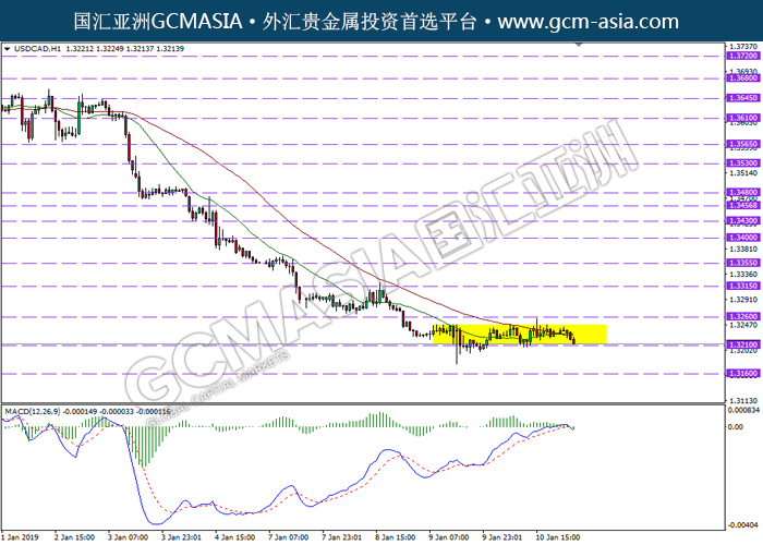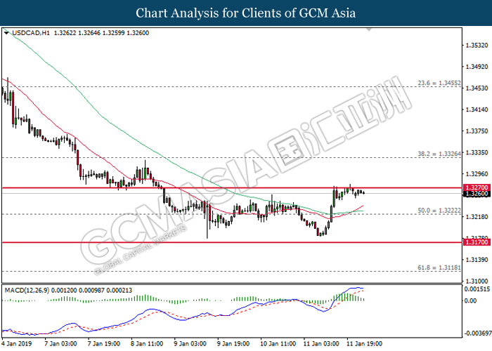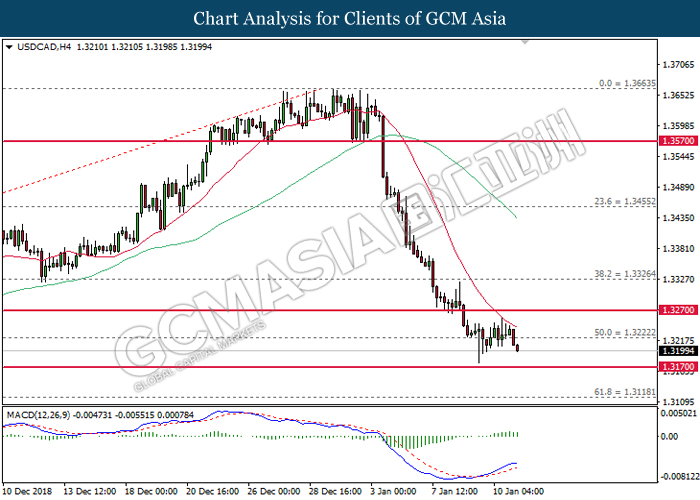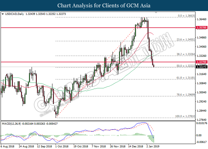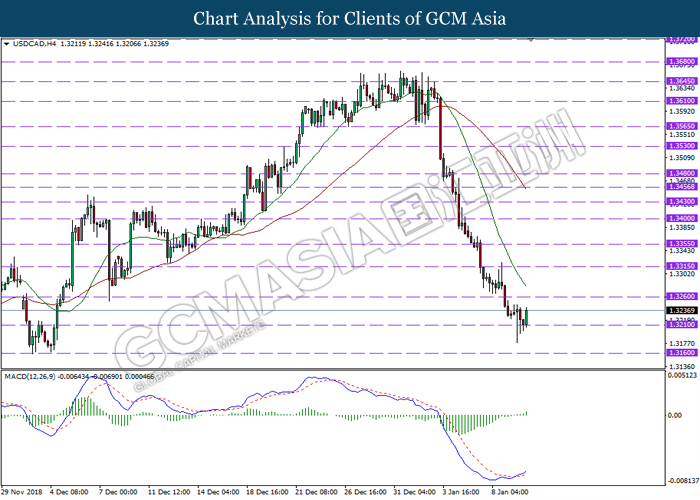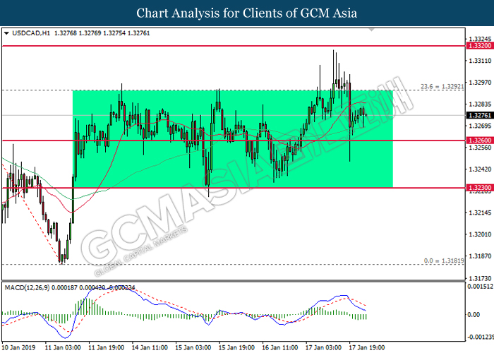 USDCAD, H1: USDCAD was traded lower following prior retracement from the 20-MA line (red). MACD which illustrate bearish signal suggests the pair to advance further downwards, towards the support at 1.3260.