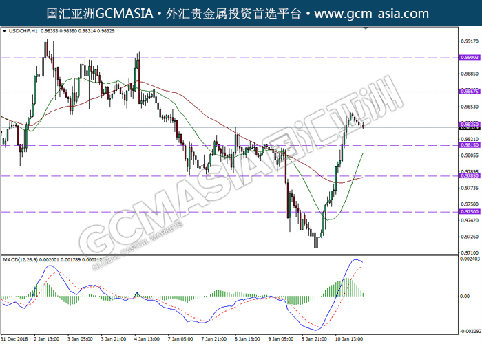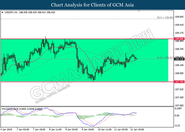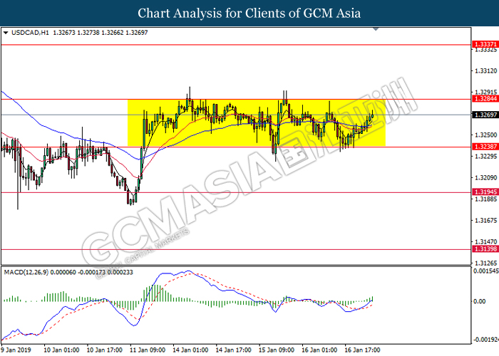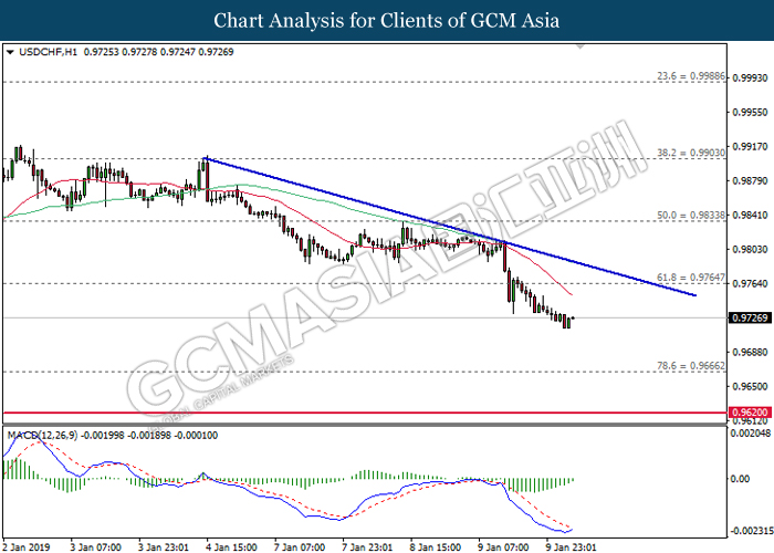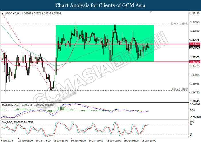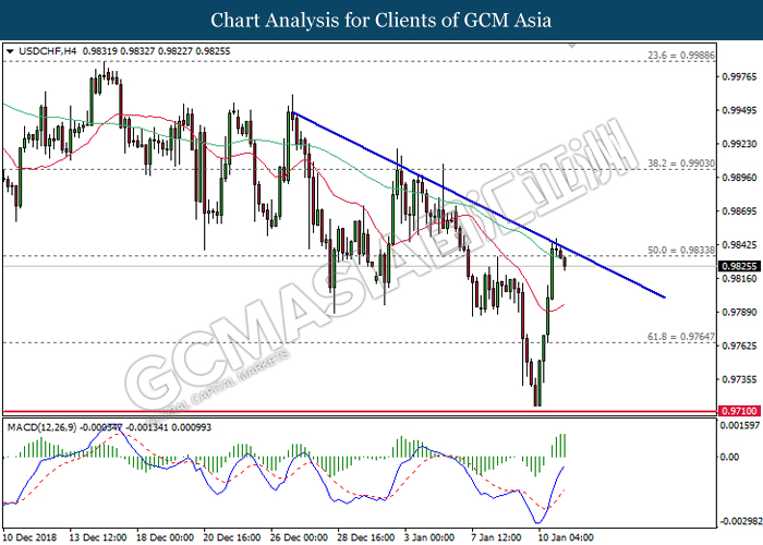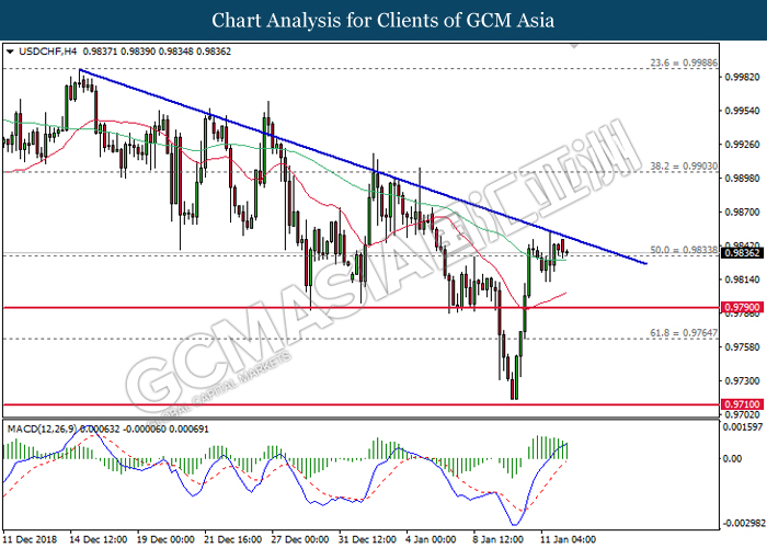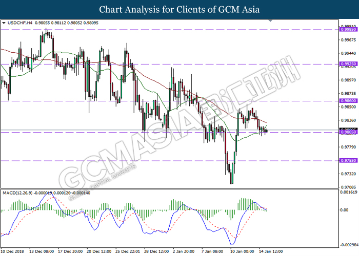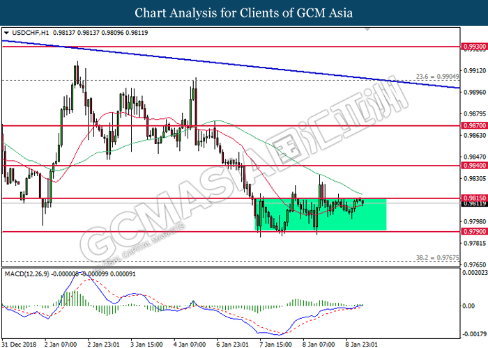 USDCHF, H1: USDCHF remains traded within a sideways channel following prior retracement from the top level. MACD which illustrate diminishing upward momentum suggests the pair to be traded lower in short-term as technical correction.