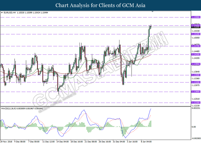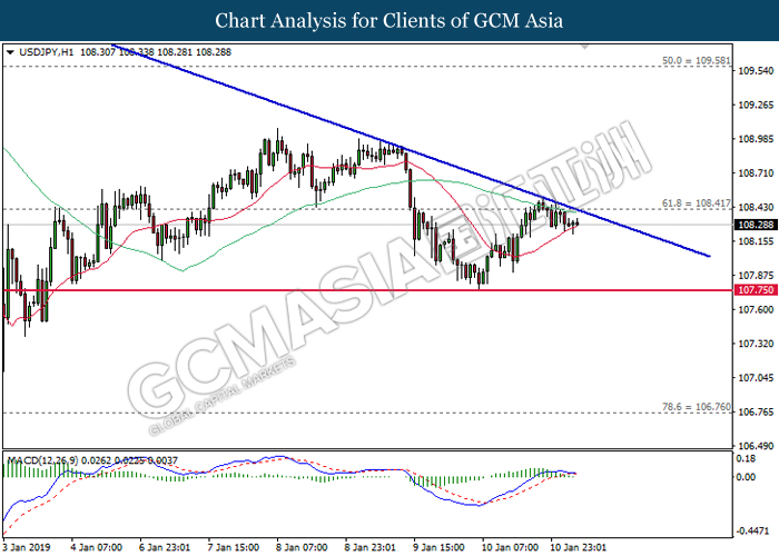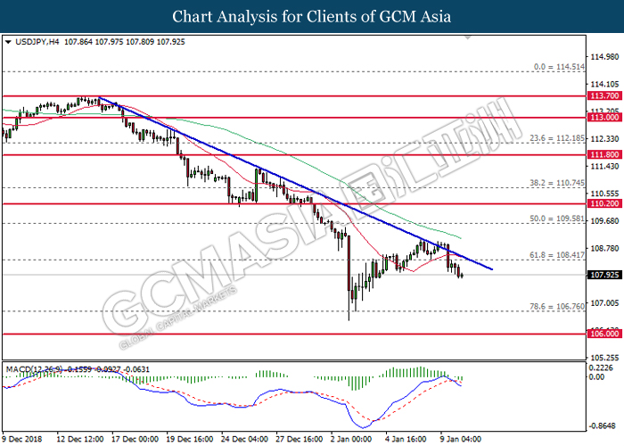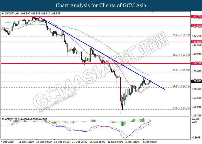 USDJPY, H4: USDJPY was traded higher while currently testing near the downward trendline. MACD which continues to illustrate bullish signal suggests the pair to extend its uptrend after successfully breaking the downward trendline.