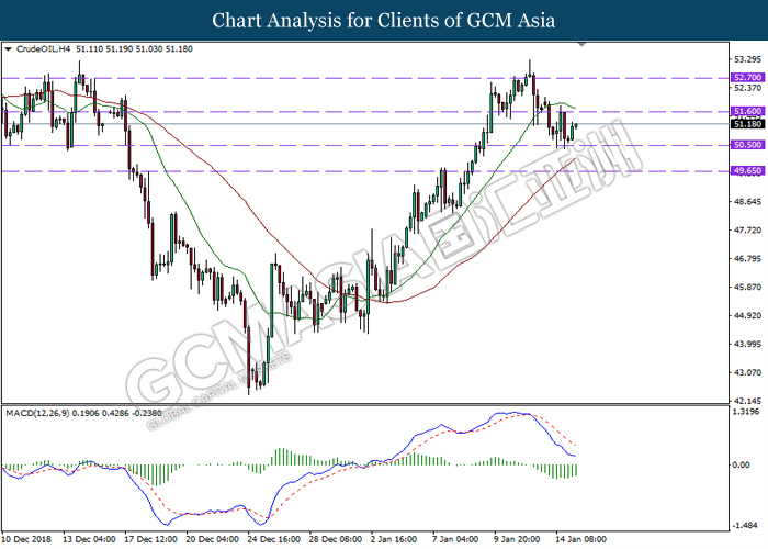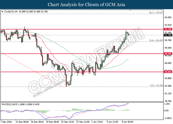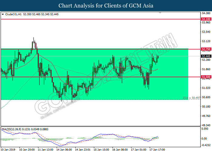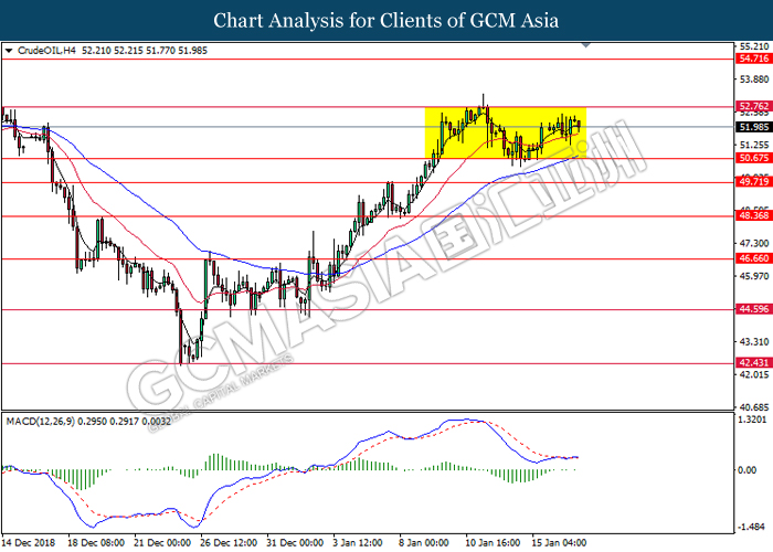 CrudeOIL, H1: Crude oil price remains traded within a sideways channel following prior rebound from its lower level. MACD which illustrate bullish signal suggests its prices to extend its gains after successfully closing above the level of 52.75.