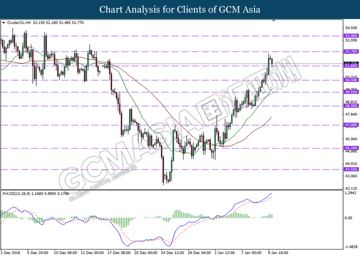 CrudeOIL, H4: Crude oil was traded higher while currently testing near the resistance level 52.70. MACD which display diminished bullish momentum suggest the commodity to undergo technical correction and retrace from the resistance level.