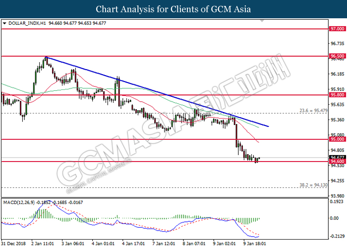DOLLAR_INDX, H1: Dollar index was traded higher following prior rebound from the support level of 94.60. MACD which illustrate diminishing bearish momentum suggests the index to be traded higher in short-term as technical correction.